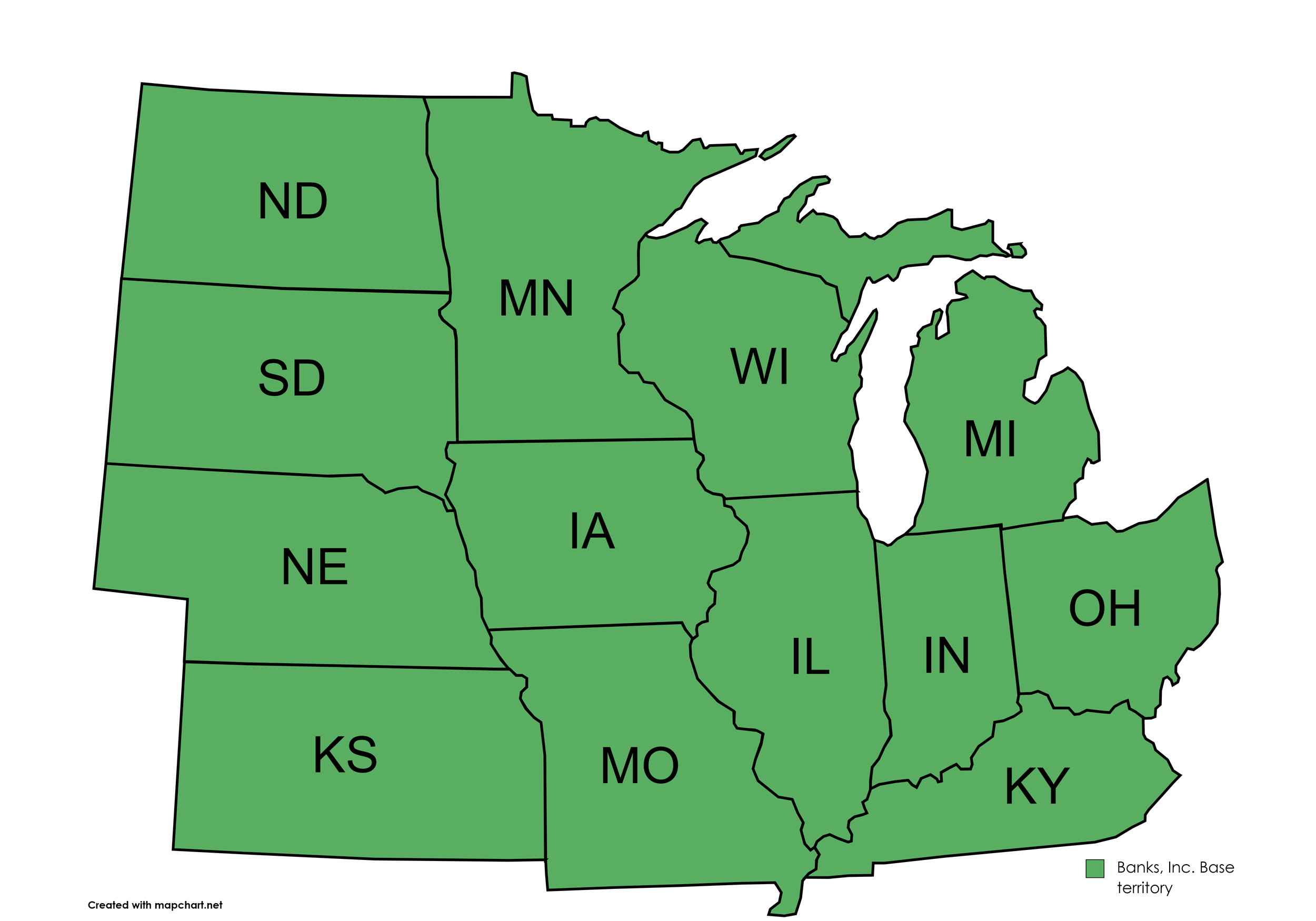 Coast to Coast, Border to Border: Our base territory encompasses thirteen states in the Midwest. We work with branches of our accounts that may extend out of this base region or work into it from other areas. No matter where you are in the United States, Banks Inc. is there for you. Additionally we network throughout the country providing a nationwide presence that ensures we can serve your needs effectively, no matter the size or location of your business.
